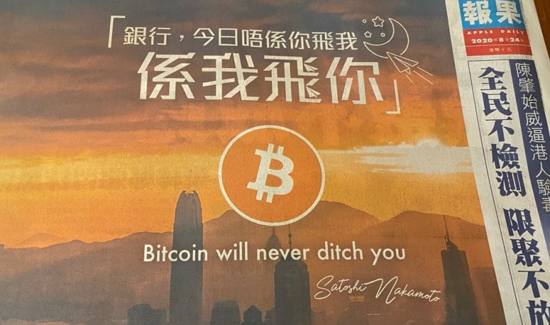 Apple Daily สื่อหนังสือพิมพ์แทปลอยด์ชื่อดังของฮ่องกงได้ลงโฆษณาเต็มหน้าคู่กลางมีใจความเชิญชวนให้ผู้อ่านเลิกใช้บริการธนาคารซะแล้วหันมาใช้บิทคอยน์แทน