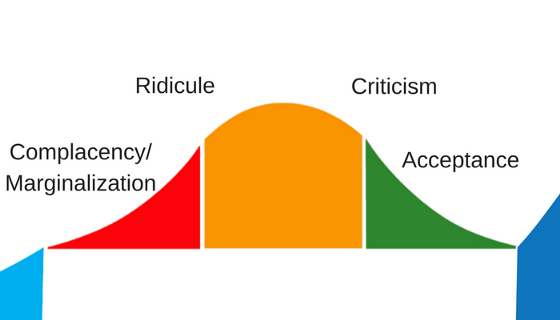 Medium writer Omar M. Khateeb posits that within that chasm, there are four stages: Complacency/Marginalization, Ridicule, Criticism, and Acceptance. You can see it in that bell curve above the chasm, also shown below: